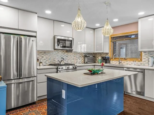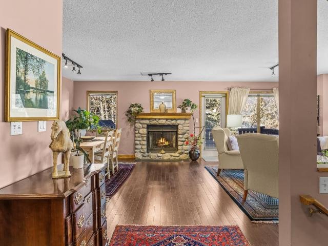 Offering 5 bedrooms and 4 bathrooms, this home delivers exceptional versatility, ideal for families, multi-generational living, or investment potential. The main level features an open-concept layout with an updated kitchen, stainless steel appliances, large island, ample storage, and an adjoining laundry room for convenience. A cozy den provides space to relax or work from home. The living and dining area is filled with natural light, mountain views, and a fireplace, opening onto a spacious deck with Cascade Mountain views. Upstairs offers two bedrooms with walk-in closets, a 4-piece bath, and a primary retreat with walk-in closet and 5-piece ensuite with fireplace. The lower level suite includes a bright living and dining area with kitchen, stainless steel appliances, in-suite laundry, two bedrooms, and a 3-piece bath. With a separate entrance, it offers excellent flexibility. Enjoy the fully fenced yard, low-maintenance landscaping, private patio, and storage shed.