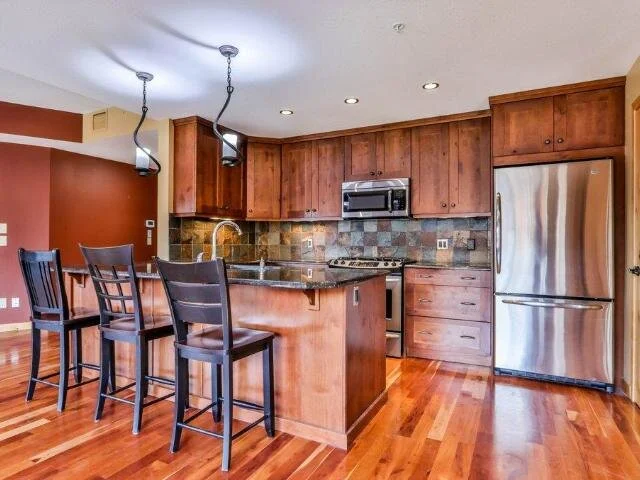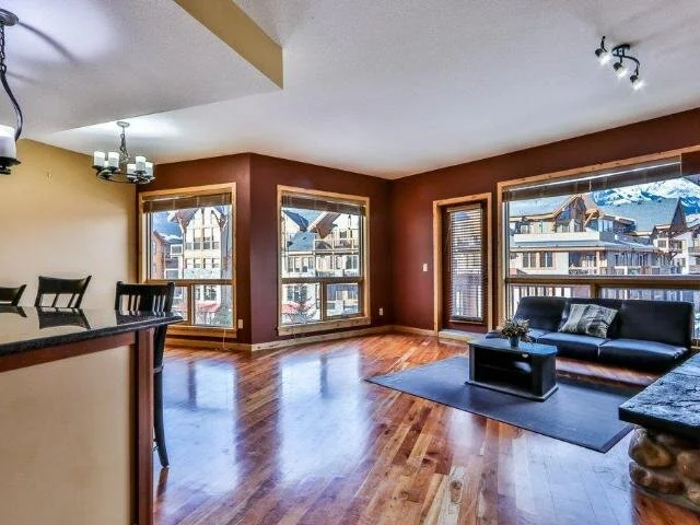After an easy 10 minute walk to browse the downtown galleries and shops, stroll home along the Spring Creek boardwalk past the log Opera house where a theatre group or yoga class may be happening. Delight your family and friends with the stunning mountain skyline you see as you cross the threshold into your unit. Your 180 views won't change since the construction at this end of Spring Creek is mostly complete. The spacious open concept living area means everyone can mingle, and enjoy the views while relaxing in front of the fireplace or putting out some tasty hors d'oevres in the kitchen. If your guests want to stay up later than you, the master bedroom provides a cozy retreat with its own fireplace. The second bedroom has direct access to the main bath and if the kids are staying overnight there's room in the den for a few foamies. This home is beautifully finished with cherry hardwood floors in every room and many thoughtful features that will please you throughout the day.